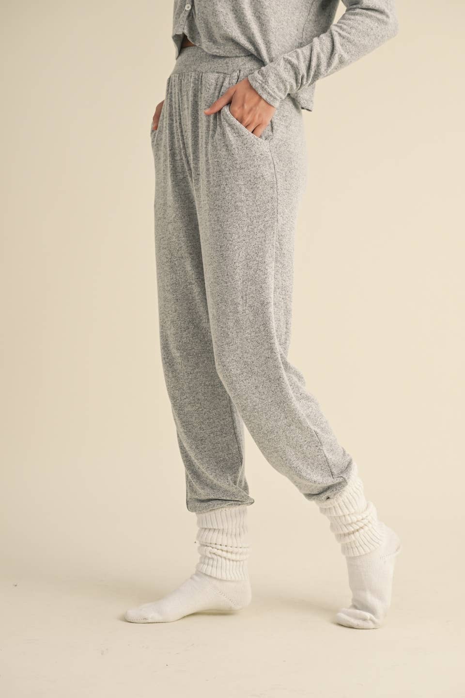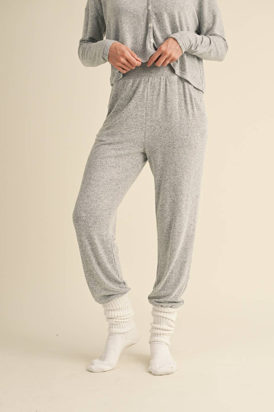 Buttery-soft brushed hacci jogger pants. Relaxed fit for maximum comfort. INSEAM S - 27" M - 27 1/4" L - 27 1/2" 56% Rayon, 22% Nylon, 22% Polyester